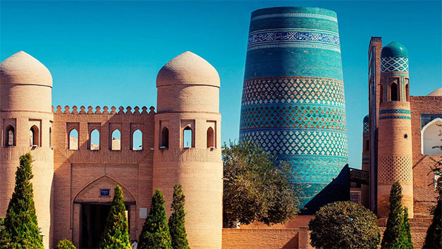 Stadtbesichtigung in Chiwa: Kalta Minor (kurzes Minarett), Medrese Muhammad Amin Khan, Juma Moschee (Freitagsmoschee), Kuhna Ark (alte Festung), Muhammad Rahim Khan Medrese, Medrese und Minarett von Islam Khodja, Pachlavon-Machmud-Mausoleum, Tosh-Hovli-Palast.