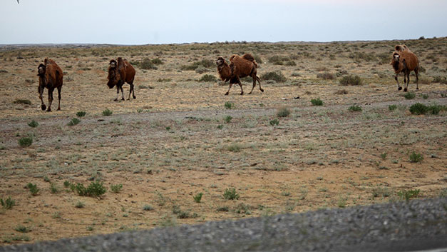 Départ à Noukous, sur la route visite la ville Mouyank. Jusqu’aux années 1980, la ville se situait au bord du sud de la mer d’Aral. Il y avait une grande fabrique de conserves de poisson, principal employeur de la ville. Aujourd’hui la mer est à 200 km de Mouynak qui s’est transformé en cimetière de bateaux.